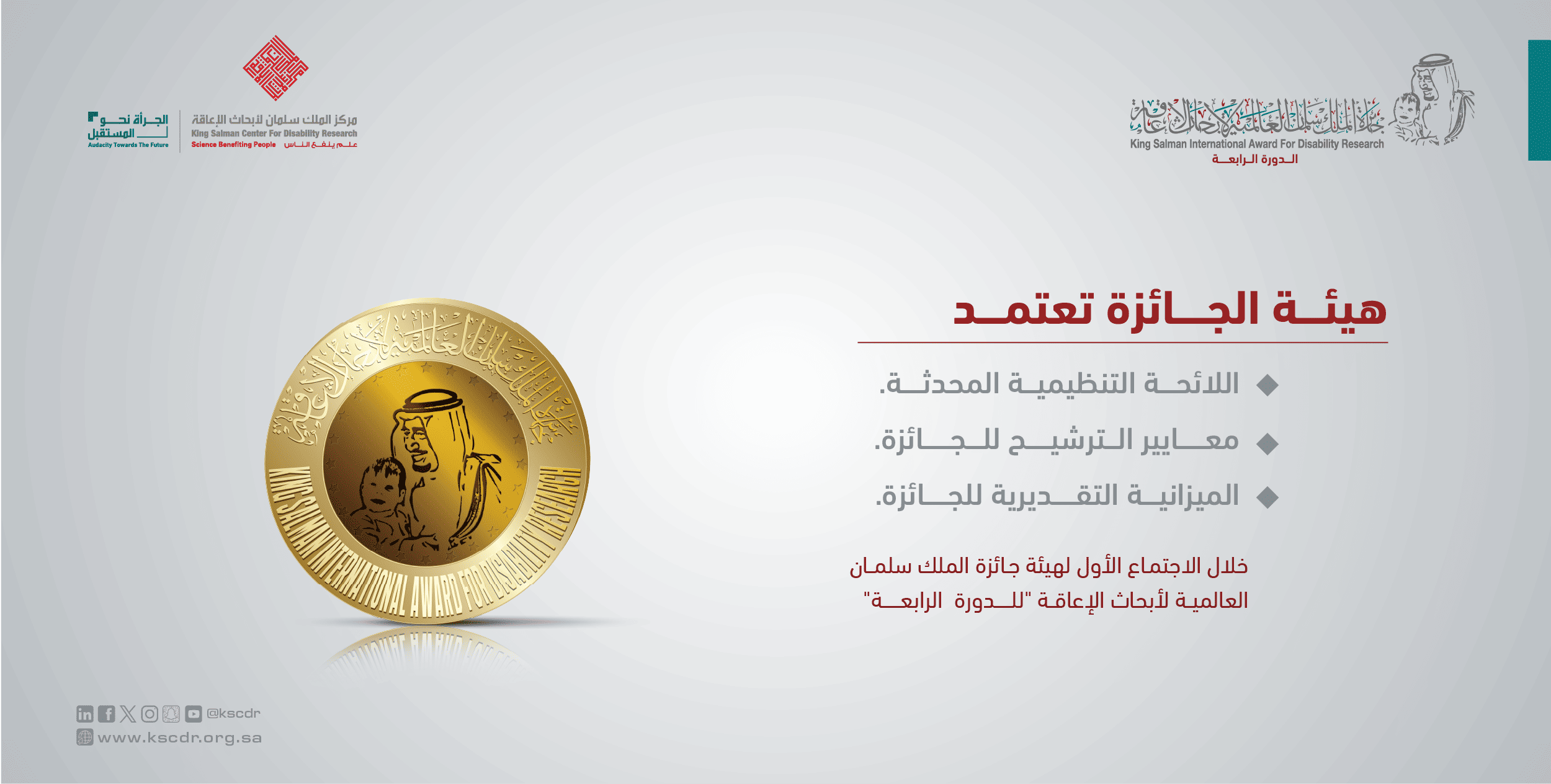 جدير بالذكر أن هيئة جائزة الملك سلمان العالمية لأبحاث الإعاقة تضم في عضويتها للدورة الرابعة كل من، معالي الدكتور محمد بن علي آل هيازع، معالي الدكتورة إيناس بنت سليمان العيسى، المهندس محمد بن مساعد السيف، عبد الله بن عبد اللطيف الفوزان، عبد المنعم بن راشد الراشد، ياسر بن حسن شربتلي، الدكتور عبد الله بن محمد الجغيمان، والدكتور بدر بن سعد الهجهوج.