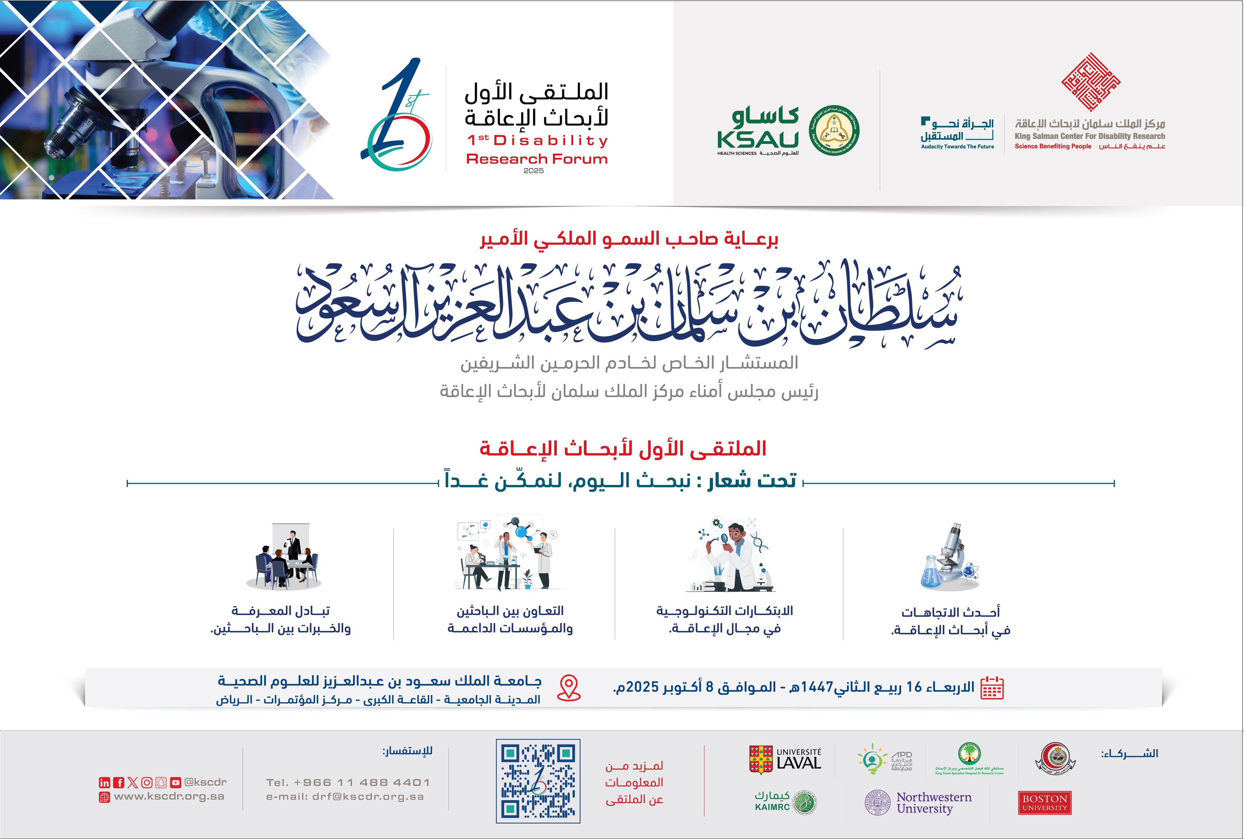 تحت رعاية صاحب السمو الملكي الأمير سلطان بن سلمان بن عبد العزيز، المستشار الخاص لخادم الحرمين الشريفين، رئيس مجلس أمناء مركز الملك سلمان لأبحاث الإعاقة، يعتزم مركز الملك سلمان لأبحاث الإعاقة تنظيم الملتقى الأول لأبحاث الإعاقة، تحت شعار " نبحث اليوم، لنمكن غداً " وذلك يوم الأربعاء 16 ربيع الثاني 1447هـ الموافق 8 أكتوبر 2025م، في القاعة الكبرى بمركز المؤتمرات بجامعة الملك سعود بن عبد العزيز للعلوم الصحية،الرياض، وذلك من الساعة التاسعة صباحًا وحتى الرابعة مساءً.